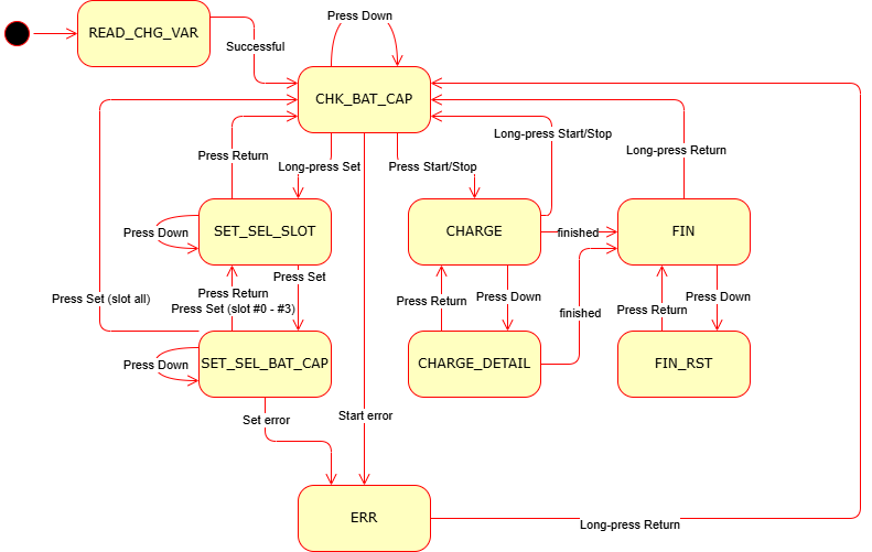 | 1 | CHARGE | Charge state. The system checkes the charge states of all units. If all units finshed charging, stansits to FIN state. If down button is pressed, transits to CHARGE_DETAL state. If start/stop button is long-pressed, sends reset commands to all units. If the reset commands are succeeded, transits to READ_CHG_VAR state. |