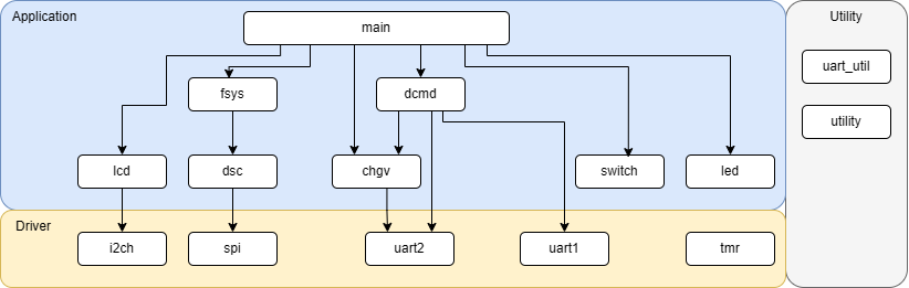 | アプリ | dcmd | デバッグコマンドジュール。UARTのデバッグコマンドを処理するモジュール。 充電コントローラ自体のデバッグ機能と、各充電ユニットのデバッグ機能へのアクセスを提供する。 |