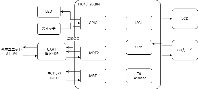 システムブロックは図1の通りです。LCDはI2C、SDカードはSPIで制御します。充電ユニットとの通信はUART2で行います。 充電ユニットは4ユニットあるので、アナログスイッチのUART選択回路で接続先を切り替えます。UART1はデバッグ用です。 LEDの点灯制御とスイッチの入力はGPIOで行います。T0は1msec周期のシステム全体のティックをカウントします。